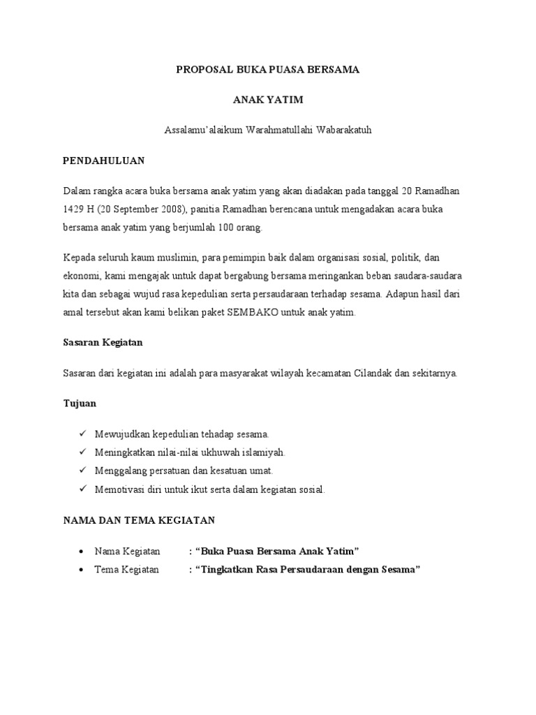 Didalamnya terdapat terdapat suatu kewajiban ibadah puasa ( shaum ) bagi orang yang beriman, dalam rangka mendekatkan diri kepada allah swt dan sekaligus sebagai alat dalam rangka membersihkan diri / hati / jiwa manusia dari perbuatan keji (dosa). Ow iya sebelumnya tentunya juga ada halaman judul, halaman pengesahan, kata pengantar dan daftar isi ya,. Assalamu'alaikum warahmatullahi wabarakatuh pendahuluan dalam rangka acara buka bersama anak yatim yang akan diadakan pada tanggal 21 ramadhan 1432 h (21 agustus 2011), kami komunitas kemayoran peduli sesama berencana untuk mengadakan acara buka bersama anak yatim di panti asuhan. Demikianlah proposal ini kami sampaikan, dengan harapan kegiatan santunan yatim dan dhuafa ini dapat terlaksana dan berjalan dengan lancar dan menjadi saranan untuk meningkatkan rasa kepedulian antar sesama yang membutuhkan. Contoh proposal berbuka puasa bersama taufiq al idrus.