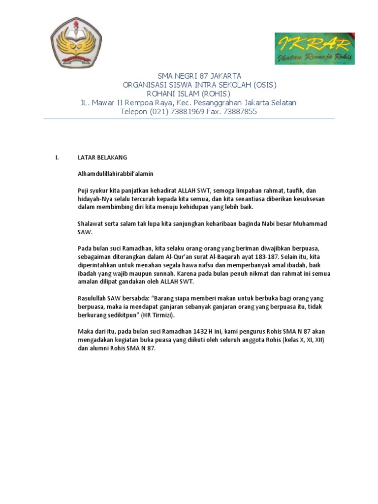 Pengadaan karpet ukuran 5 x 10 m. Kami menyadari bahwa proposal ini Bahwa bulan puasa 1 ramadhan 143 9 h akan mulai dilaksanakan pada tanggal 17 mei 2018. Belimbing rt.008/07 jagakarsa, jakarta selatan tlp. Pdf contoh proposal buka bersama dan santunan irfandi prasetya academia edu.