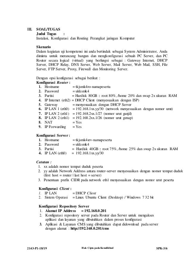 Soal Ukk Tkj 2019 : Pembahasan Solusi Soal UKK SMK TKJ Paket 3 Kurikulum 2006 ... : Tugas anda sebagai seorang teknisi jaringan adalah merancang bangun dan mengkonfig.. Ujian paket 1 melakukan instalasi dan konfigurasi serta routing pada perangkat jaringan instalasi meliputi instalasi server, konfigurasi dhcp server, dns server web server, mail. Mulai tahun pelajaran 2018/2019, ujian nasional teori kejuruan tidak lagi. Untuk tahun 2019, ukk tkj kurikulum 2013 hanya menguji pada 2 paket ujian. Pembahasan soal ukk tkj paket 2 tahun 2019 mikrotik full lengkap Tugas anda sebagai seorang teknisi jaringan adalah merancang bangun dan mengkonfig.
